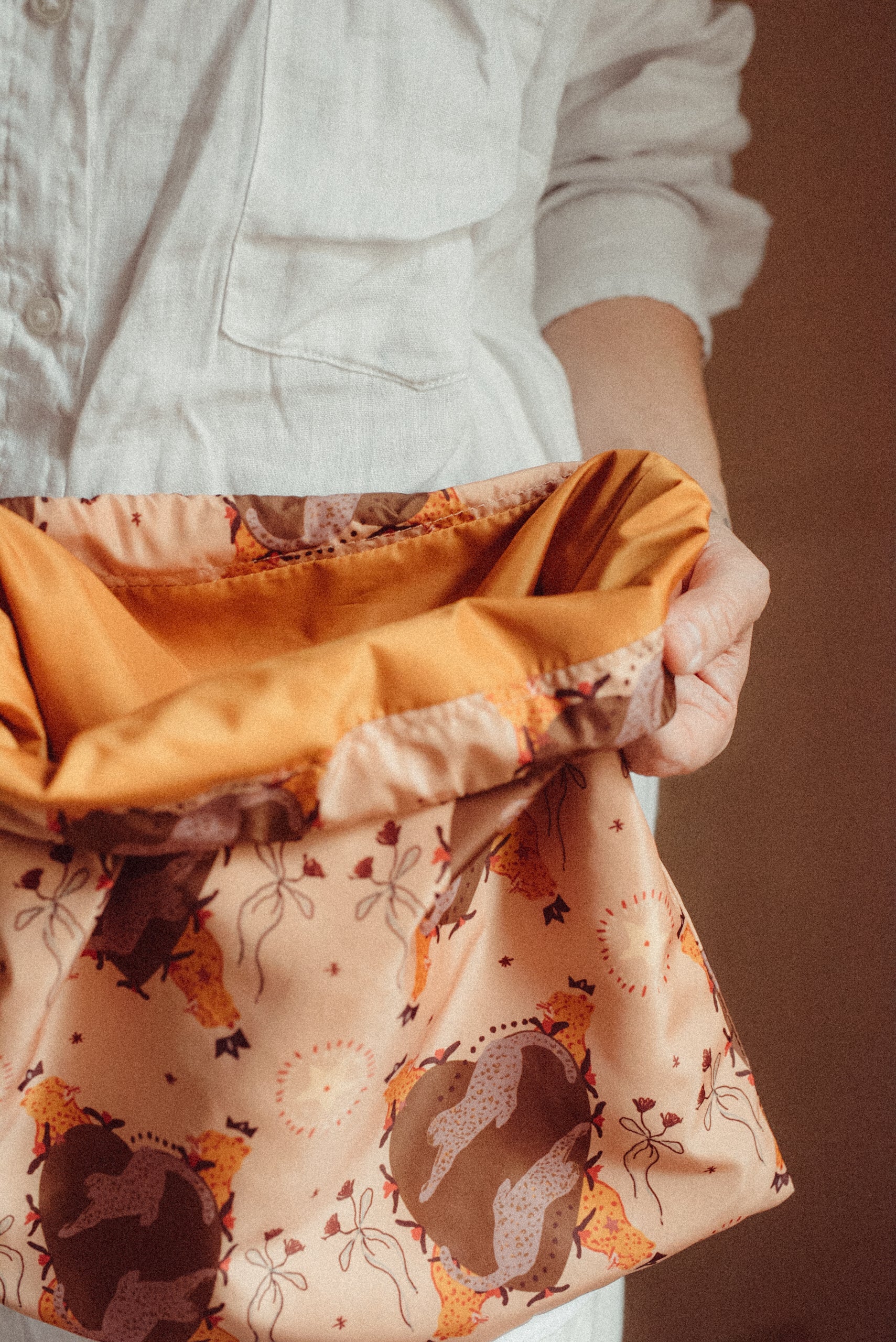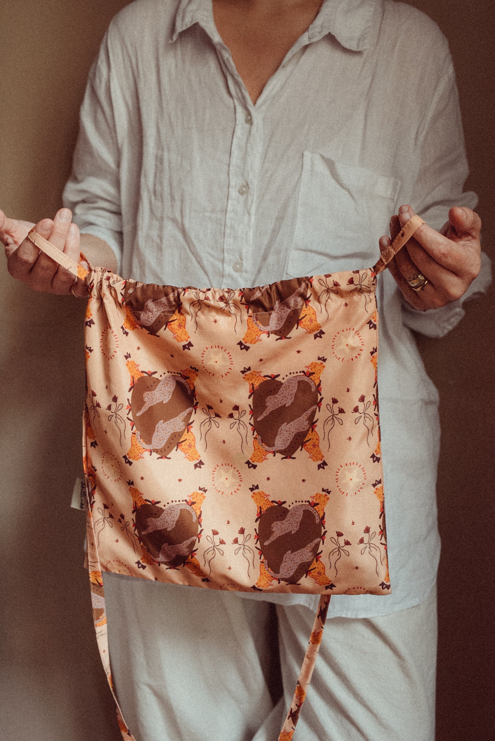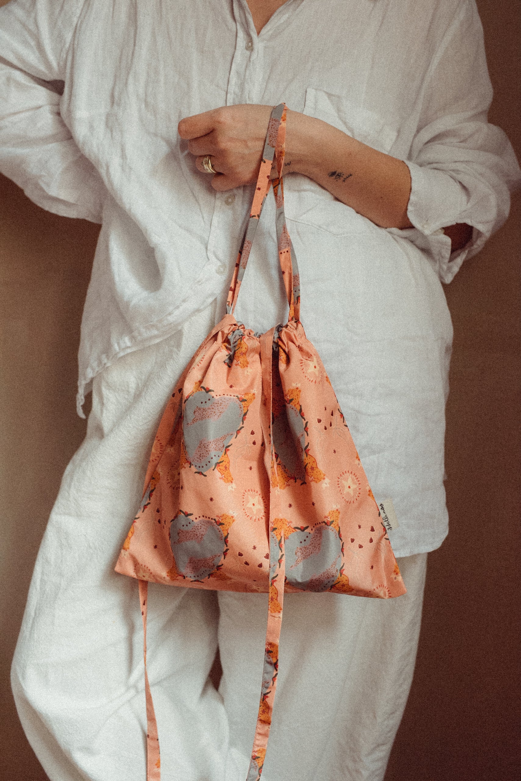 Il Sacchetto è realizzato in tela opaca di poliestere, a mano liscia, un tessuto estremamente resistente, impermeabile e leggero. La resa brillante dei colori è ottenuta con la stampa sublimatica transfer, senza utilizzo d’acqua, totalmente WATER FREE. Questo tessuto è certificato STANDARD 100 by OEKO‑TEX®.